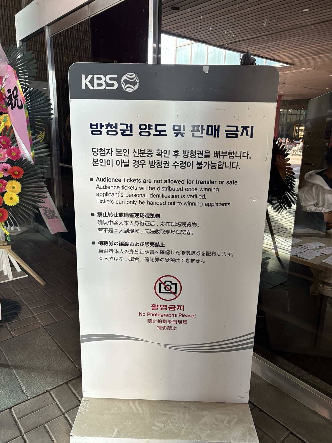 입장 전에는 티켓 확인 및 신분증/문자 확인이 있었고 촬영장 내에서는 사진/영상 촬영이 제한된다는 안내도 받았습니다.