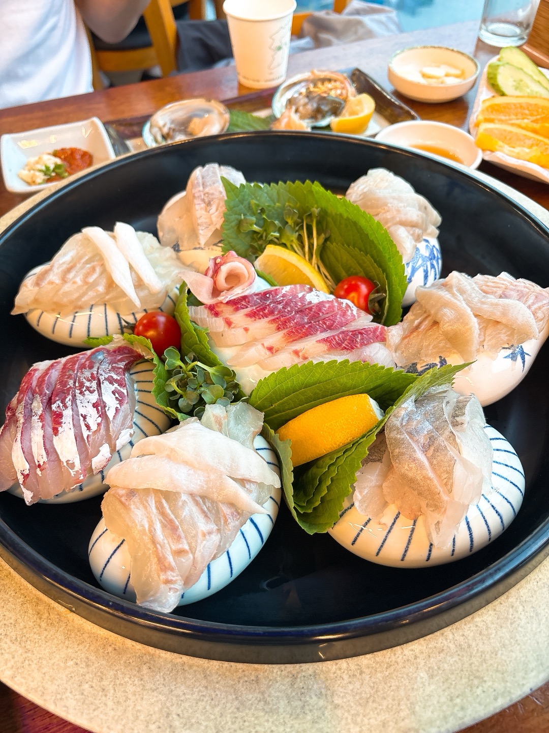 회는 광어, 우럭, 줄돔 등 여러 가지가 푸짐하게 나오고, 해삼, 멍게, 전복 등 해산물도 함께 곁들여져서 정말 풍성한 구성이었어요.