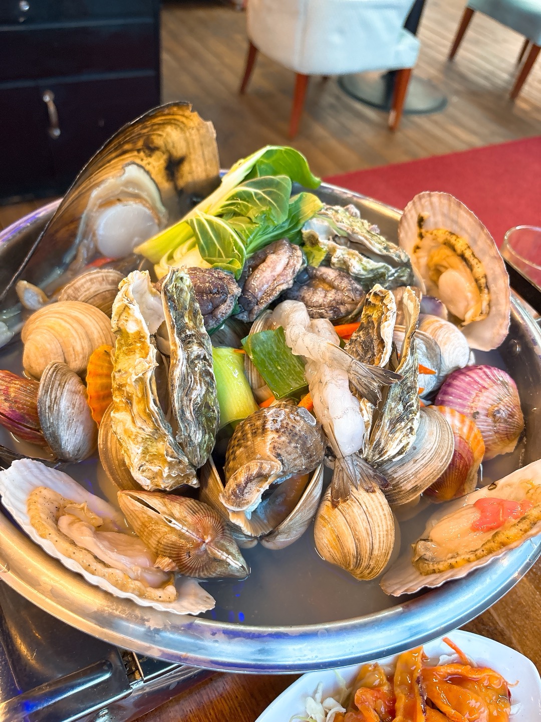 조개찜에는 가리비, 키조개, 전복 등 다양한 해산물이 들어있어서 국물 맛이 시원하고 감칠맛이 일품이었답니다.
