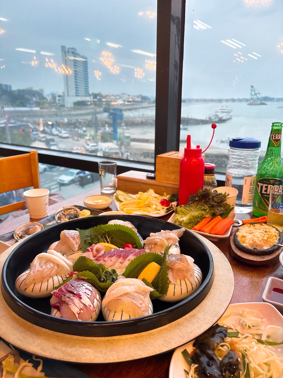 저희는 창가 쪽에 앉았는데, 저녁 노을이 지는 바다 풍경이 정말 예뻐서 감탄이 절로 나왔어요.