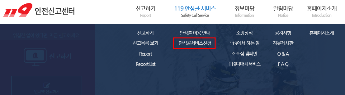 119안전신고센터 홈페이지 접속 → 안심콜서비스 신청 클릭