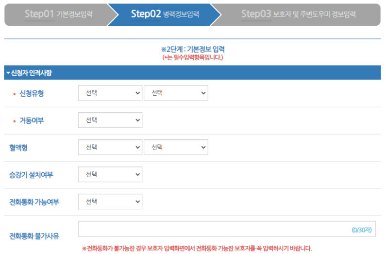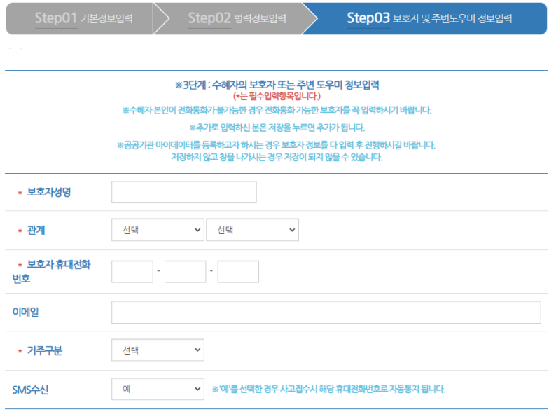 기본정보 입력 및 저장 → 병력 정보 입력 및 저장 → 보호자 관련 정보 입력 및 저장 → 신청 완료