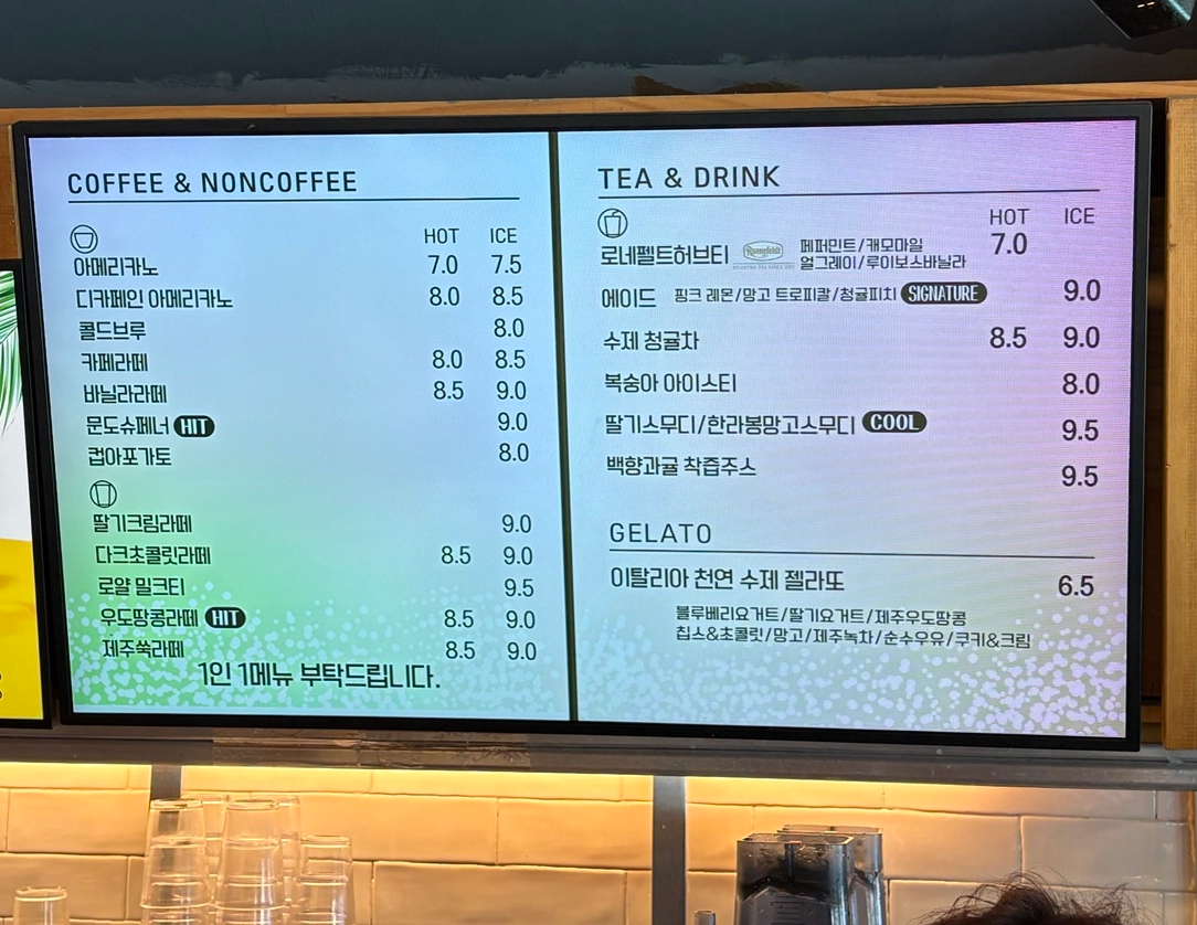 - 아메리카노, 우도땅콩라떼, 델문도에이드 등 커피/음료 다양