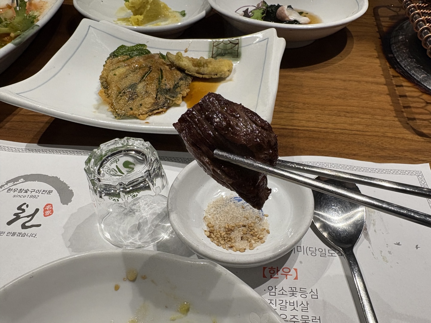 꽃등심은 부드럽고 마블링이 곱게 퍼져 있어서 소금만 살짝 찍어 먹어도 고기 본연의 맛이 제대로 느껴집니다.