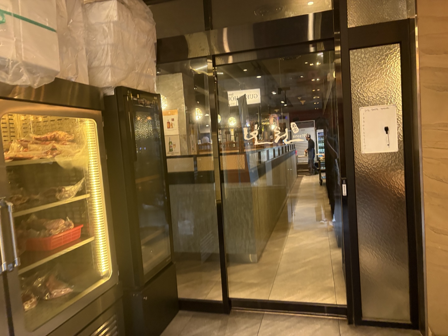 • 입구에 신선한 한우가 진열된 숙성고가 인상적