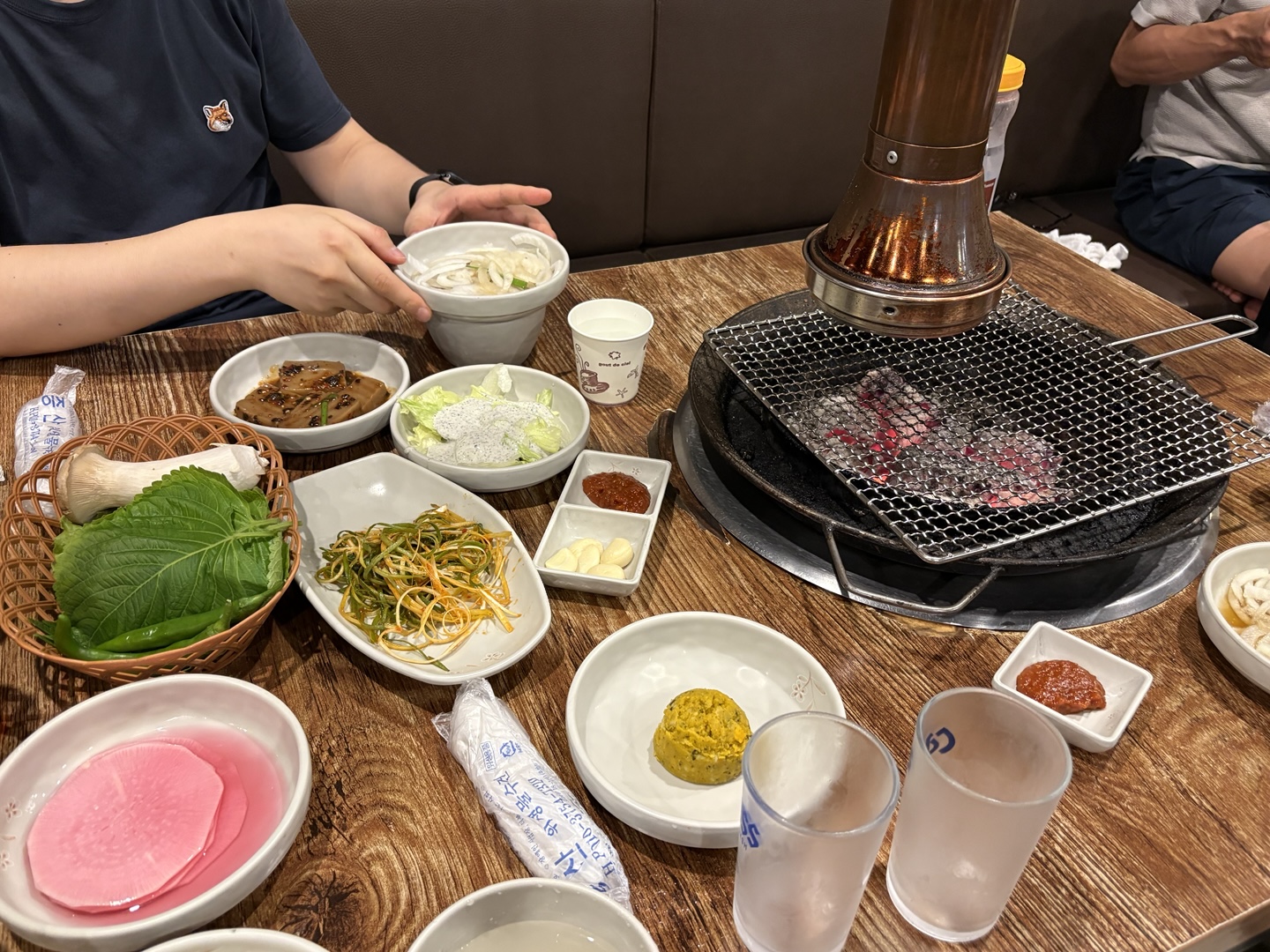테이블마다 이미 반찬과 쌈채소, 파절임 등이 한가득 세팅.