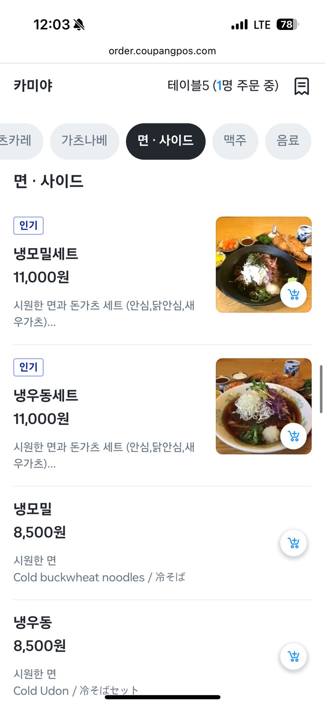이날 저희는 카미야 대표 메뉴인 오코노미가츠와 시원한 냉모밀 세트를 주문했습니다.