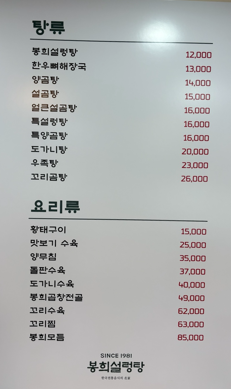 저희는 봉희설렁탕의 대표메뉴 설렁탕과 봉희곰탕을 하나씩 주문했어요.