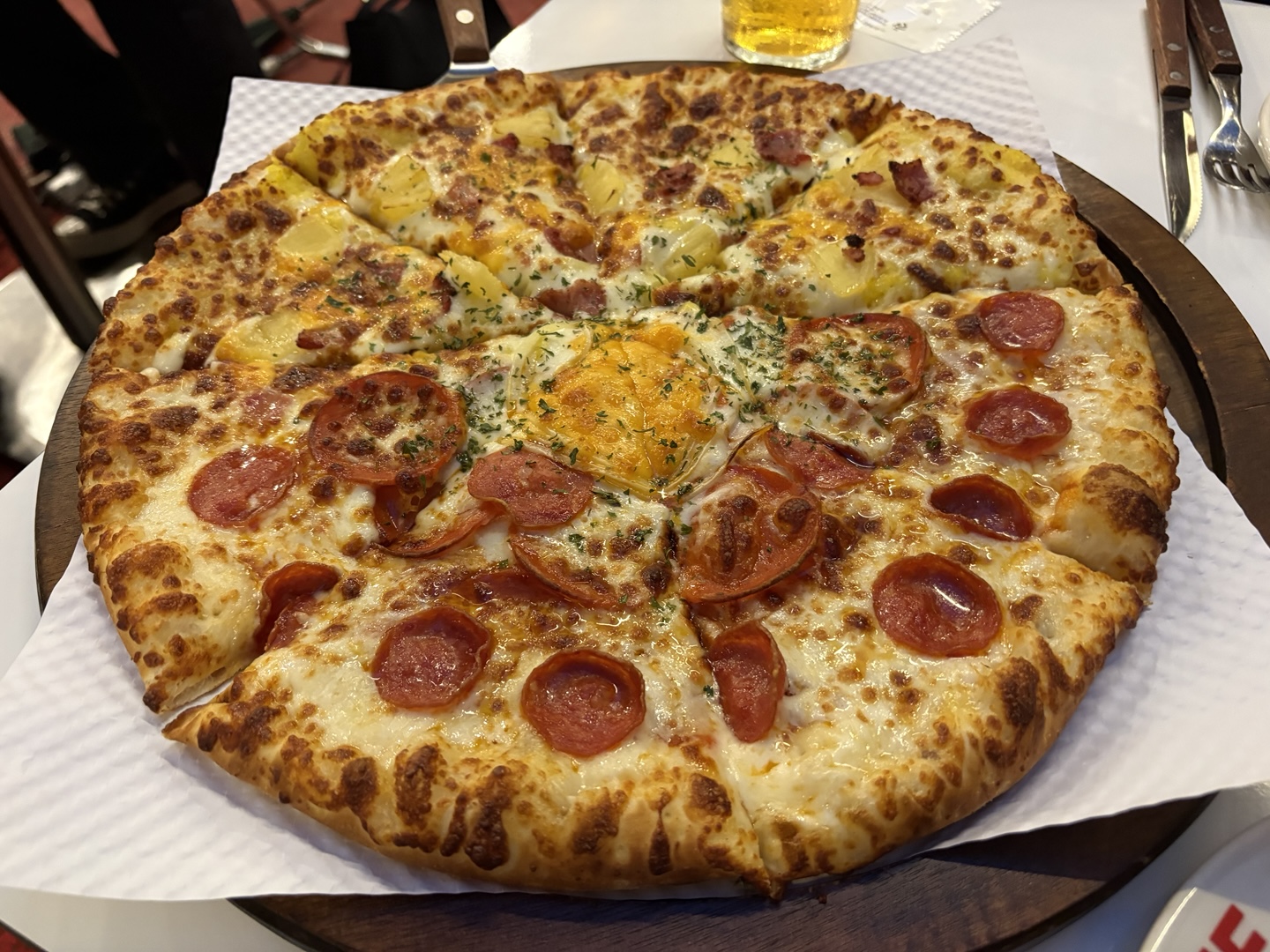 바삭한 도우와 풍성한 토핑, 고소하고 짭조름한 치즈, 페퍼로니의 매콤함이 맥주와 너무 잘 어울려서 식사가 아닌 피자 파티처럼 즐겼어요.