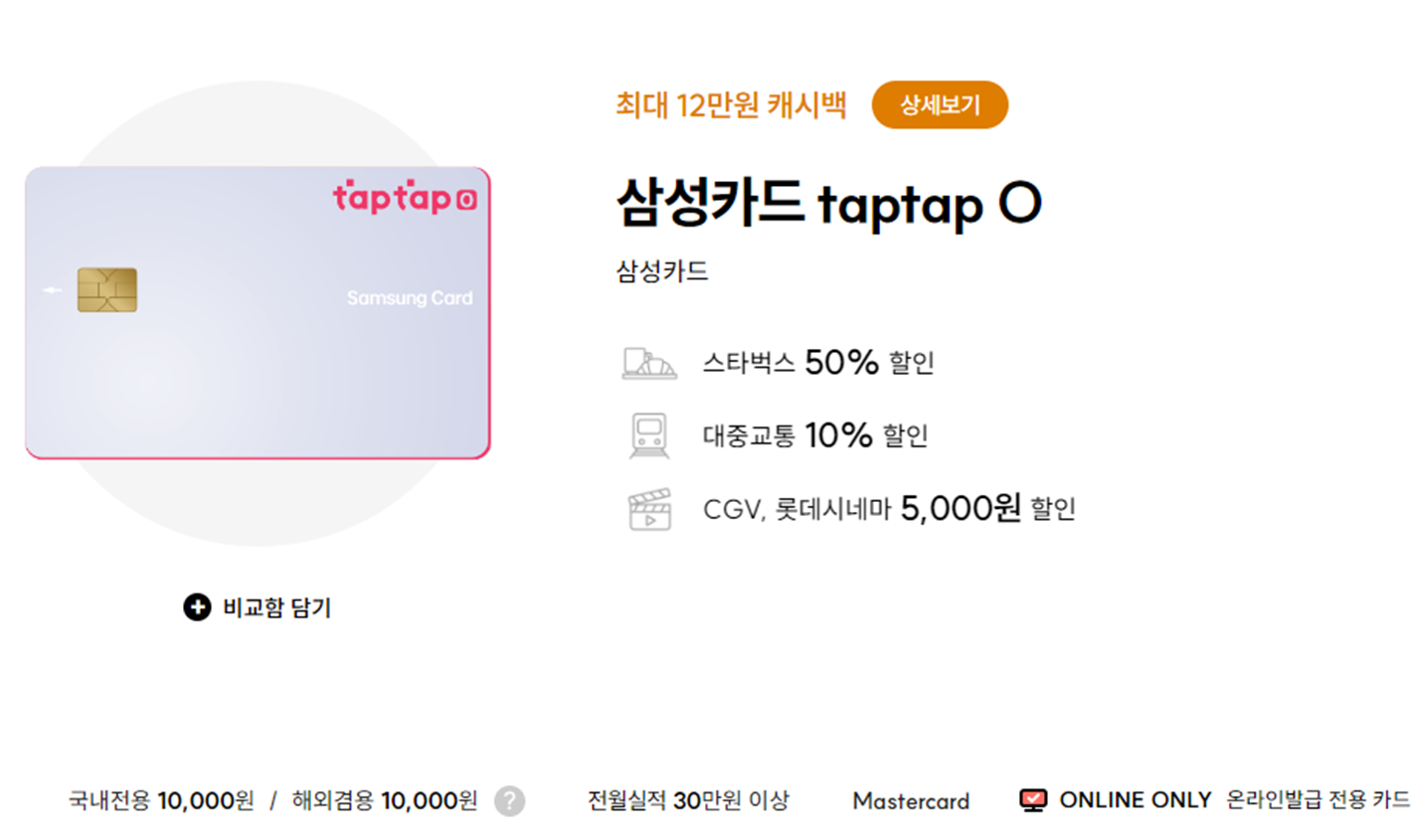 마지막 3번째 카드는 오랜 기간 인기 카드 자리를 유지하고 있는 삼성 taptap O 카드 입니다. 항상 사회초년생, 2030 세대들에게 사랑받고 있는 카드지요