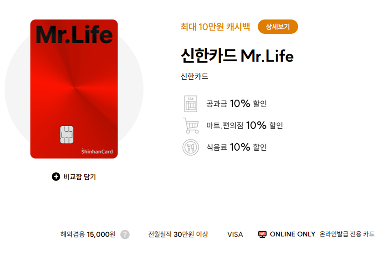 신용카드 발급 순위 및 혜택에서 1위를 차지한 신한 Mr. Life 입니다. 여러 부문에서 할인 혜택이 많은데 할인율도 10%로 높습니다.