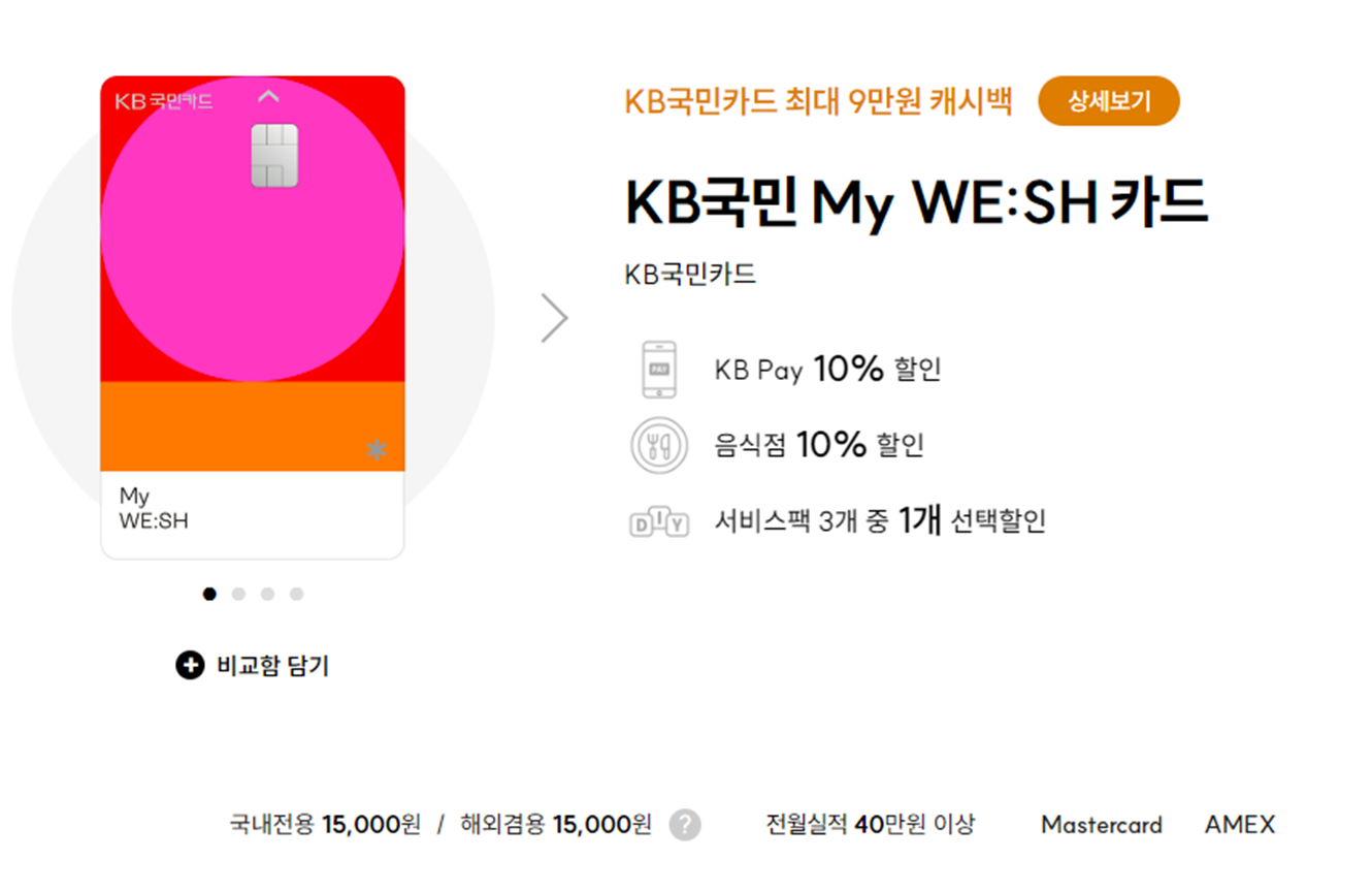 다음은 KB 국민 My WE:SH 카드입니다. 이 카드 역시 다양한 분야에서 높은 할인율이 적용되서 혜택이 많은 카드지요