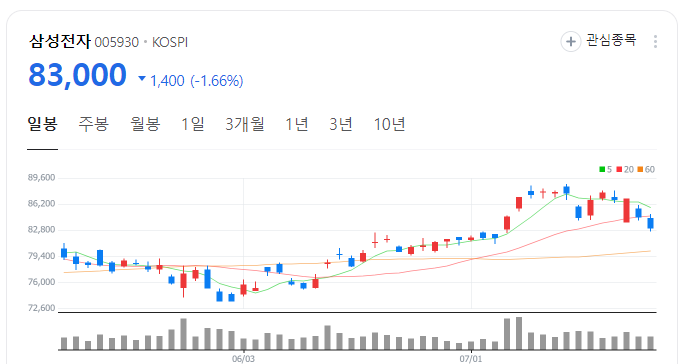 이번달에 연중 고점인 8만 8천원까지 터치했던 삼성전자 주가가