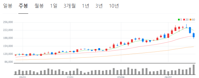최근 들어 미국발 반도체주 조정과 외국인들의 차익실현 매물이 나오면서 주가는 다시 19만원대로 내려왔습니다