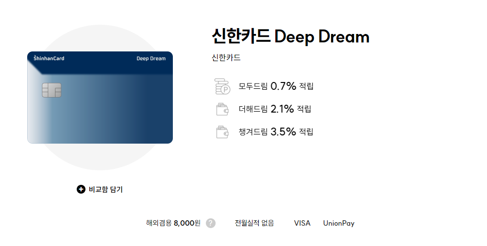 연회비도 저렴하고 전월실적도 없어서 부담없이 사용하기 좋은 카드인 신한 Deep Dream 카드예요