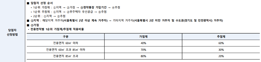 - 전용 면적 60㎡ 이하 : 가점제 40%, 추첨제 60%