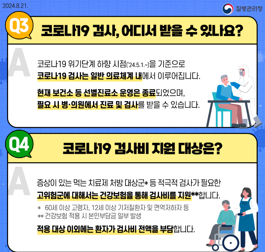 고위험군인 60세 이상 고령자, 12세 이상 기저질환자 및 면역저하자 등은 건강보험을 통해 검사비를 지원 받을 수 있습니다