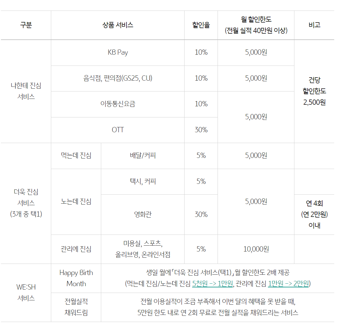 KB Pay 10% 할인, 음식점 10% 할인, 서비스팩 3개 중 1개 선택할인