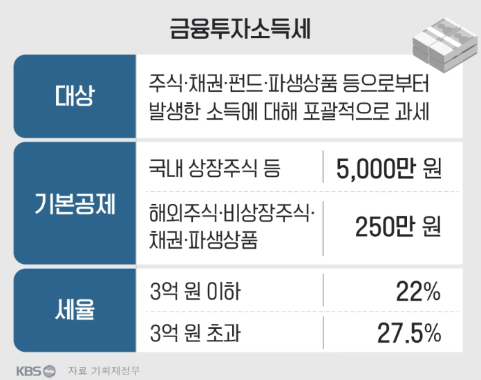 금투세는 주식, 펀드, 채권 등 금융 투자로 인해 발생한 소득에 세금을 부과하는 제도로, 정부는 부동산 등 다른 자산 소득과 마찬가지로 금융 상품에도 공정하게 과세하겠다는 취지로 추진하고 있습니다. 그러나 개인 투자자들과 전문가들은 이 제도가 과연 정부의 말대로 공정한 과세인지, 아니면 안그래도 코리아 디스카운트로 저평가 받고있는 국내 주식시장 활성화를 저해하고 투자자의 부담만 늘리는 것인지에 대해 논란을 벌이고 있습니다.