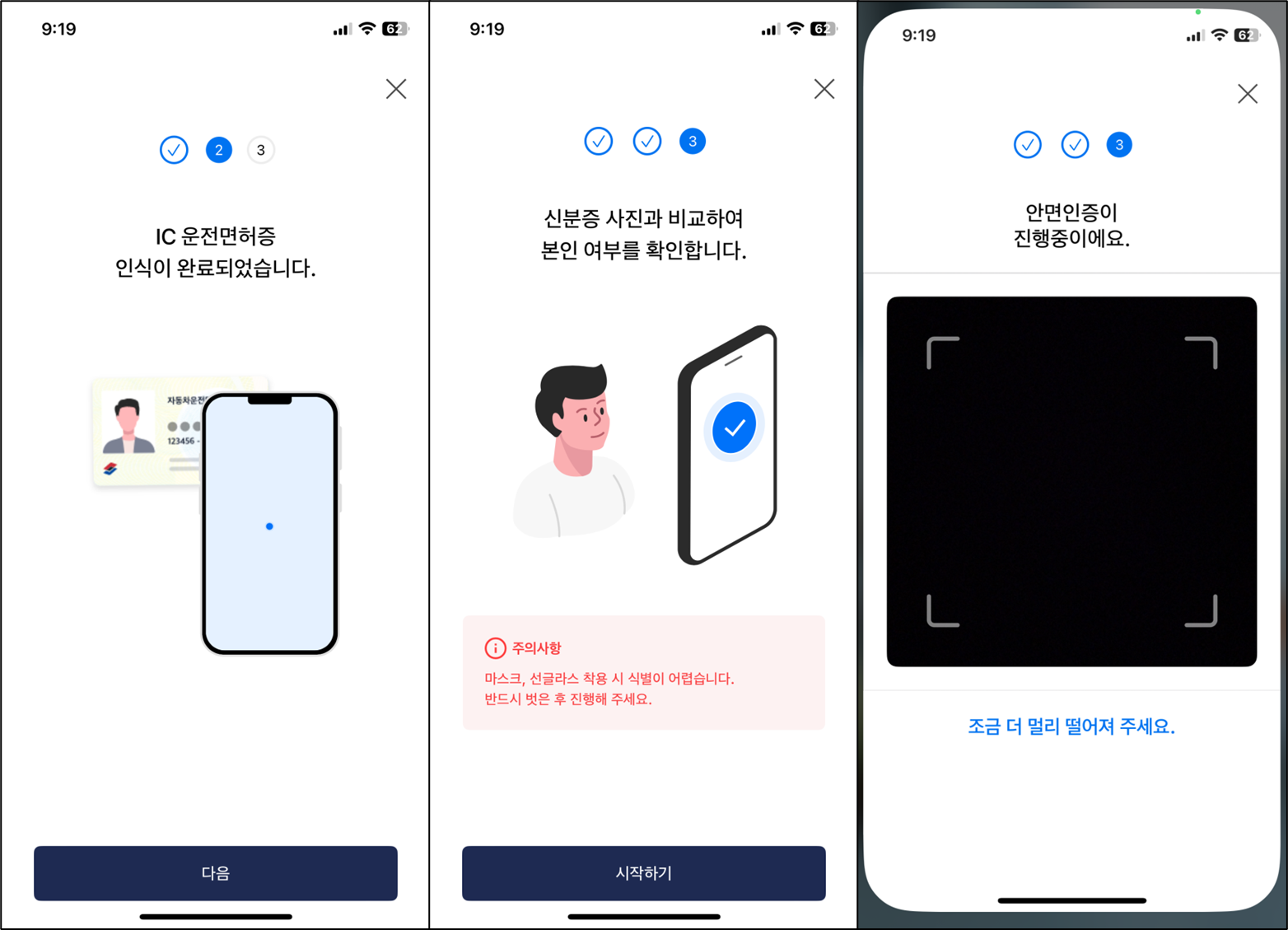 IC 운전면허증에 등록된 사진과, 모바일 신분증을 등록하려는 인물이 동일한지 인증하는 절차입니다.