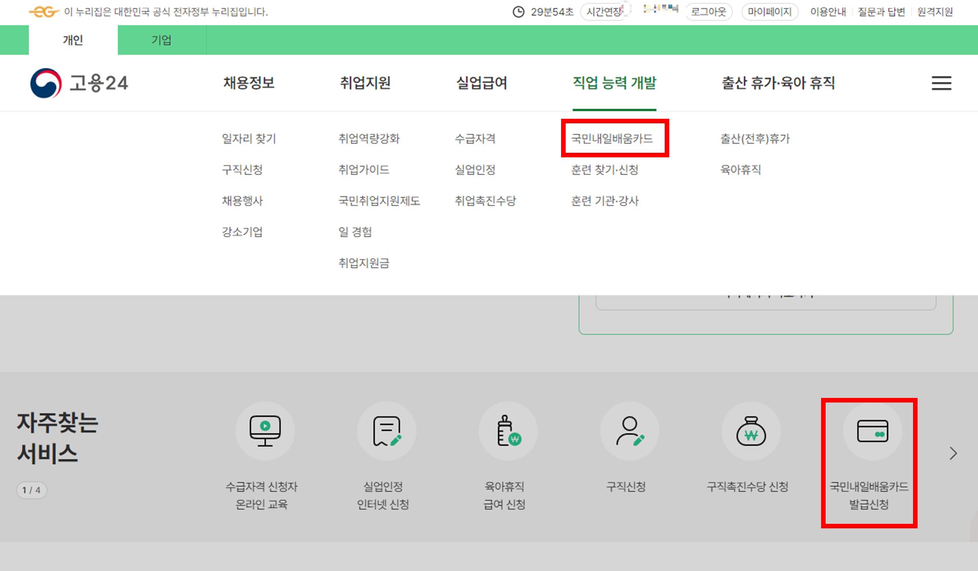 - 고용24홈페이지(http://work24.go.kr) → 회원가입 → 직업능력개발 → 국민내일배움카드 → 발급 신청