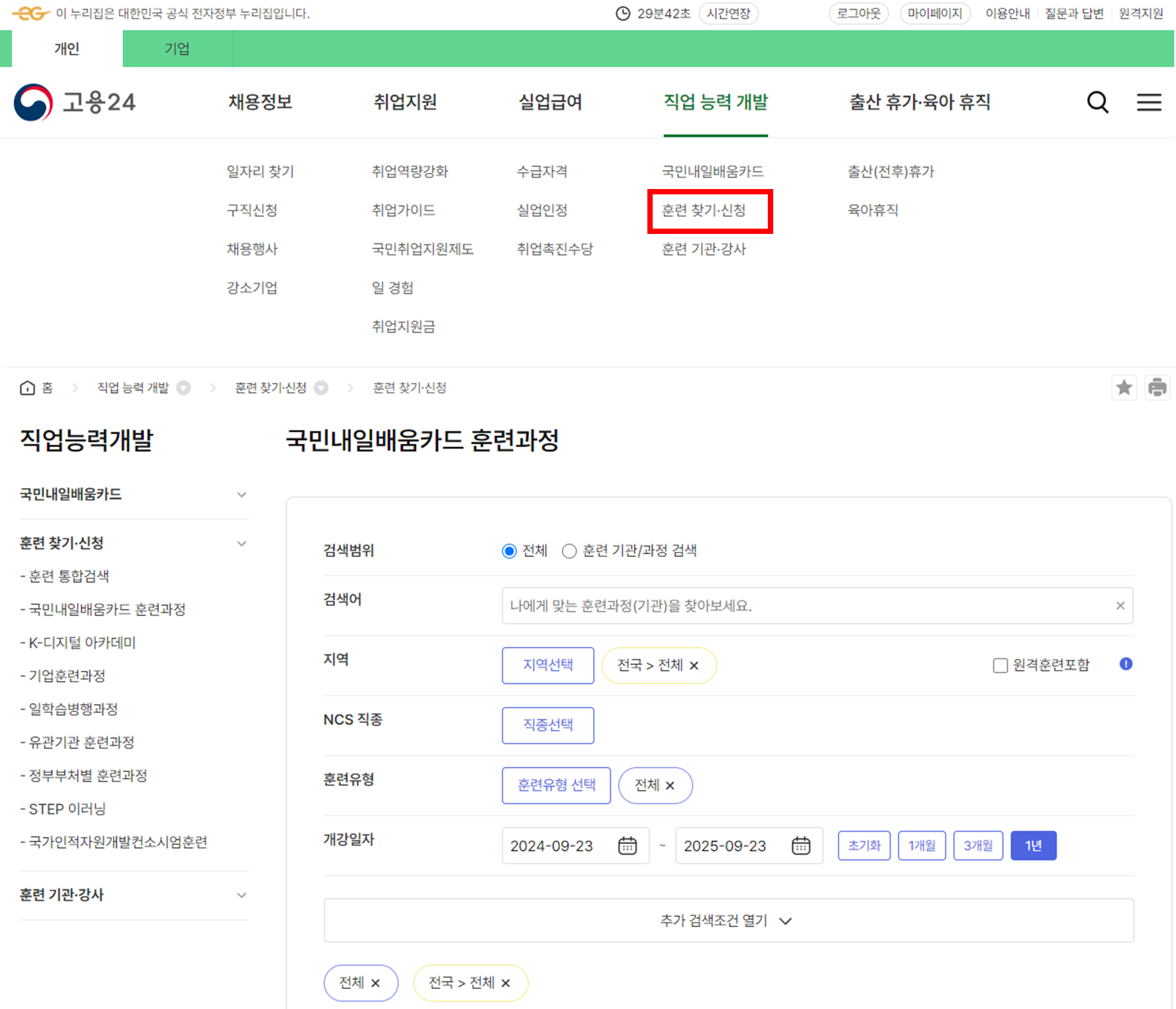 - 고용24홈페이지(http://work24.go.kr) → 직업능력개발 → 훈련 찾기·신청