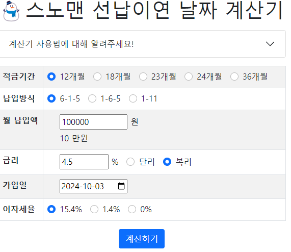 3년짜리 적금도 무료로 날짜 계산 가능한 스노맨 선납이연 날짜 계산기