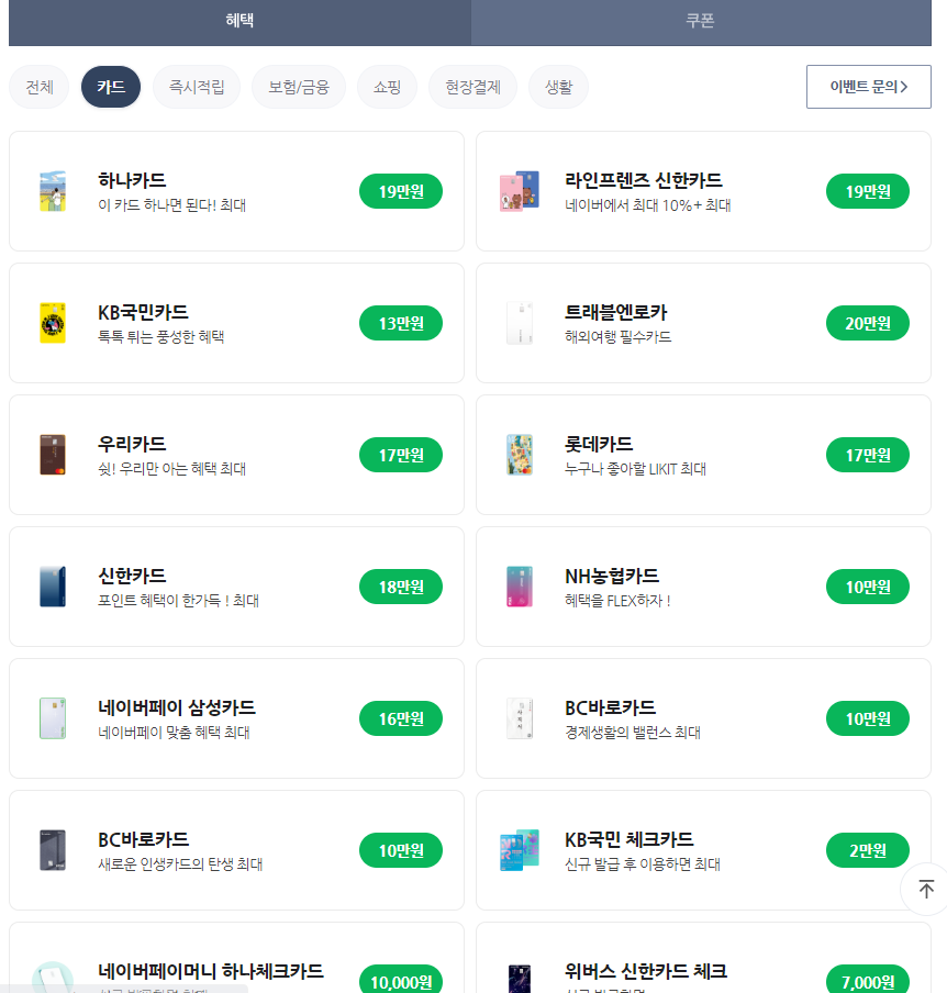 네이버페이의 카드 이벤트는 네이버 로그인 -> 네이버 페이->혜택/쿠폰 탭에서 확인하실 수 있습니다.