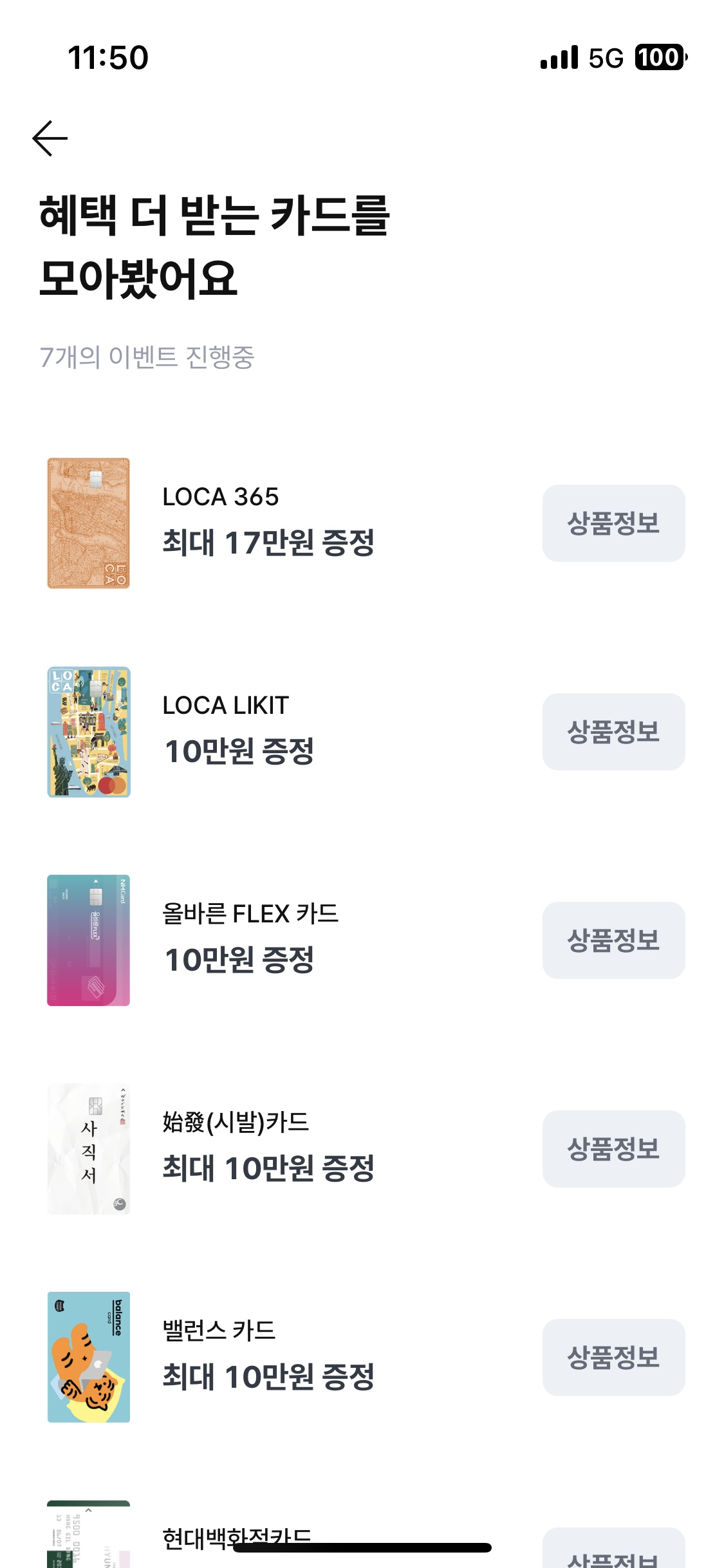 뱅크샐러드는 금융쇼핑 탭 -> 신용카드 -> 이벤트 전체 보기를 누르면 확인할 수 있습니다.