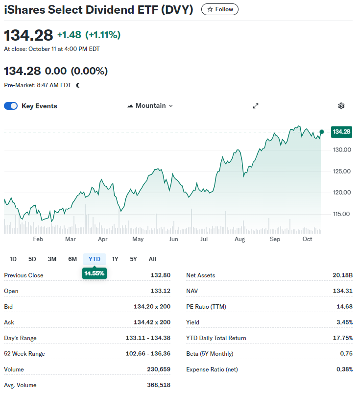 다음 종목인 DVY는 미국 내에서 안정적인 배당금을 지급하는 기업에 집중적으로 투자하는 ETF입니다. 배당률은 3.45%이고 연간 운영 비용은 0.38%입니다. 주로 배당 성장이 안정적인 중대형 기업들로 구성되어 있으며, 금융 및 유틸리티 섹터에 큰 비중을 두고 있습니다. 배당주 중에서도 특히 수익성이 좋은 기업들을 엄선하여 안정적인 배당 수익을 목표로 하고 있는 ETF입니다.