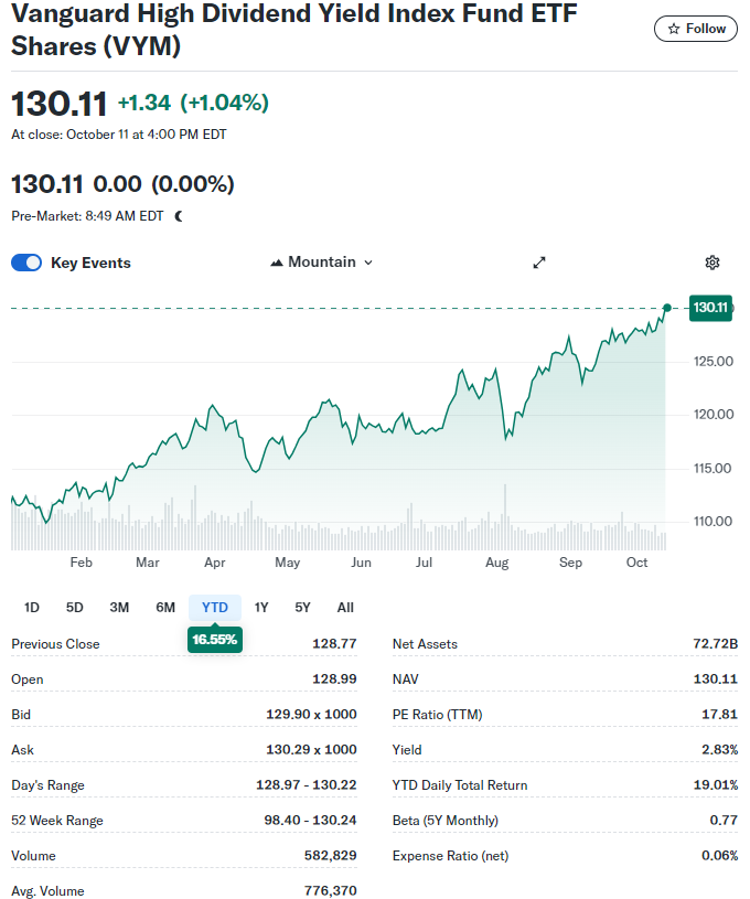 다음은 VYM로 배당 수익률이 높은 대형기업에 집중 투자하는 ETF 종목입니다. Vanguard가 운용하는 이 ETF는 비용이 낮고, 포트폴리오의 다각화가 잘 되어 있어 리스크 관리가 잘 되는 것이 장점입니다. VYM의 배당률은 2.8%이고 연간 운용 비용은 0.06%로 낮은 편입니다. 주요 투자 대상은 금융, 헬스케어, 소비재 등 다양한 산업군에 걸쳐 있으며, 투자 대상 기업들은 대체로 안정적으로 배당을 지급하고 있는 기업들입니다.