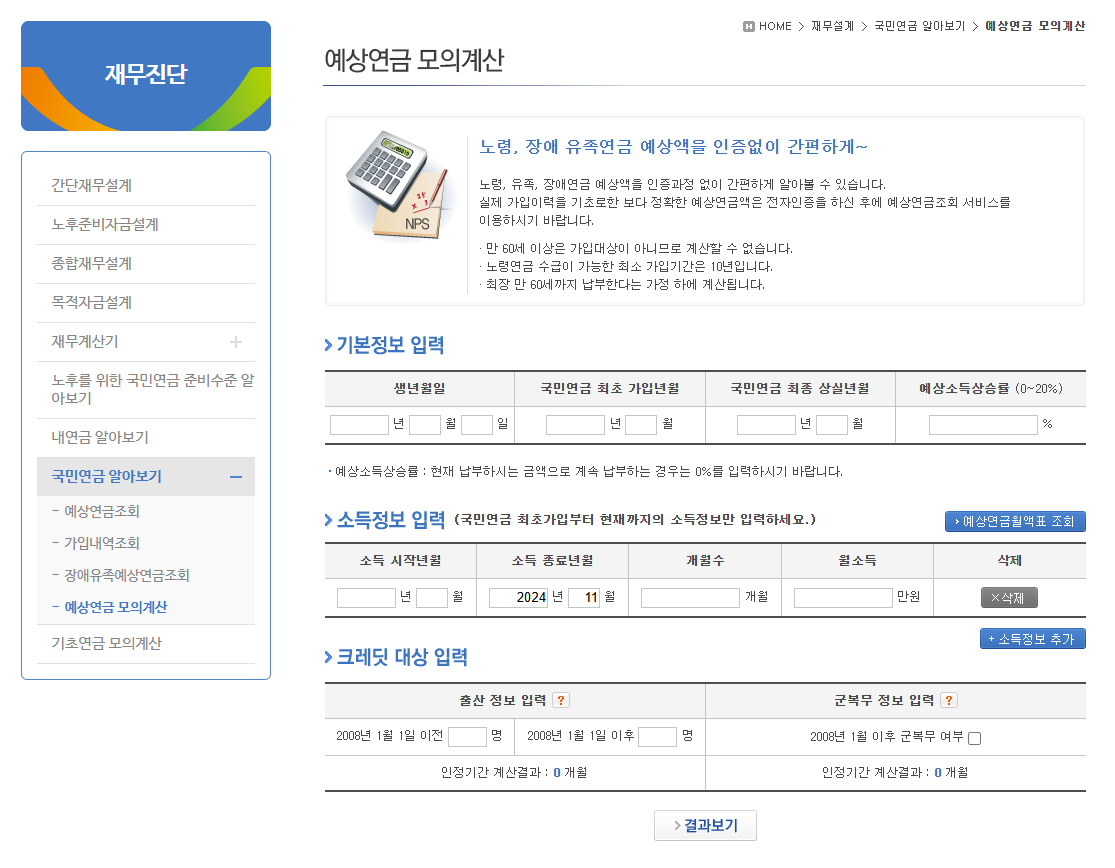 가입시기와 납부기록을 확인한 뒤에 기본정보와 소득 정도만 입력하면 간단하게 조회해 볼 수 있습니다.