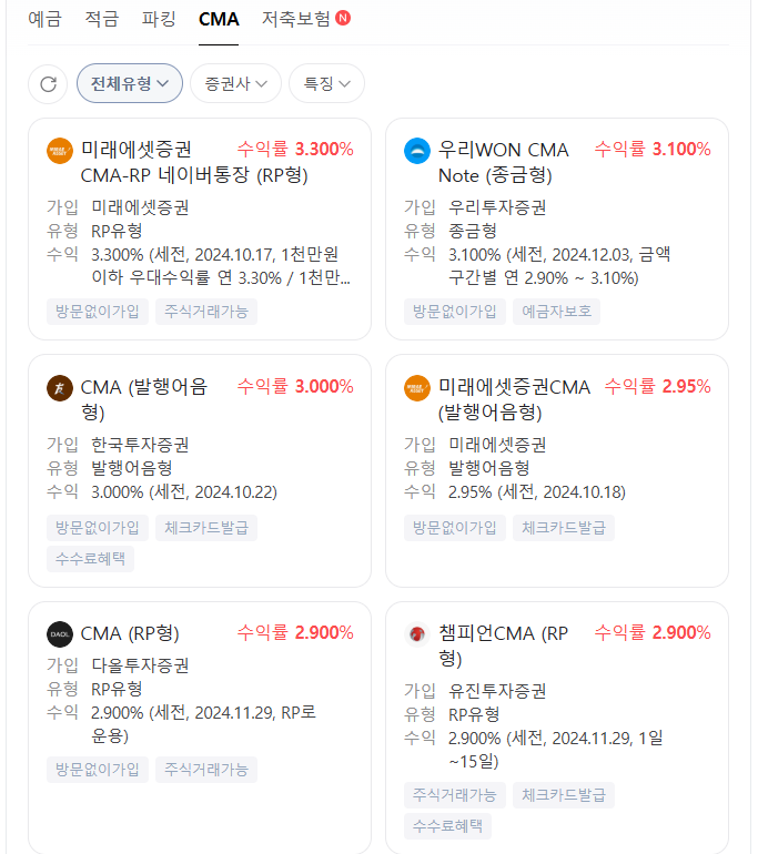 최근 전 세계적인 기준 금리 인하 기조에 따라 CMA 계좌의 금리도 점차 낮아지고 있으니 CMA 상품에 투자하시려는 분들은 이 점에 유의하시기 바랍니다.