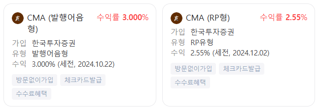또한 한국투자증권 CMA 계좌에는 발행어음형과 RP형 상품이 있습니다. 한국투자증권 발행어음형 CMA 통장의 금리는 3.0%이고 RP형은 2.55%입니다. (2024년 12월 기준, 세전)