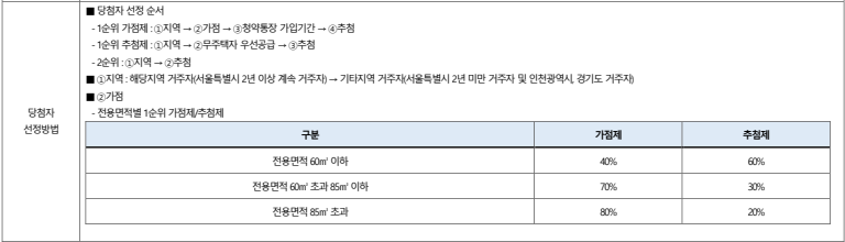 - 전용면적 60㎡ 이하 : 가점제 40%, 추첨제 60%