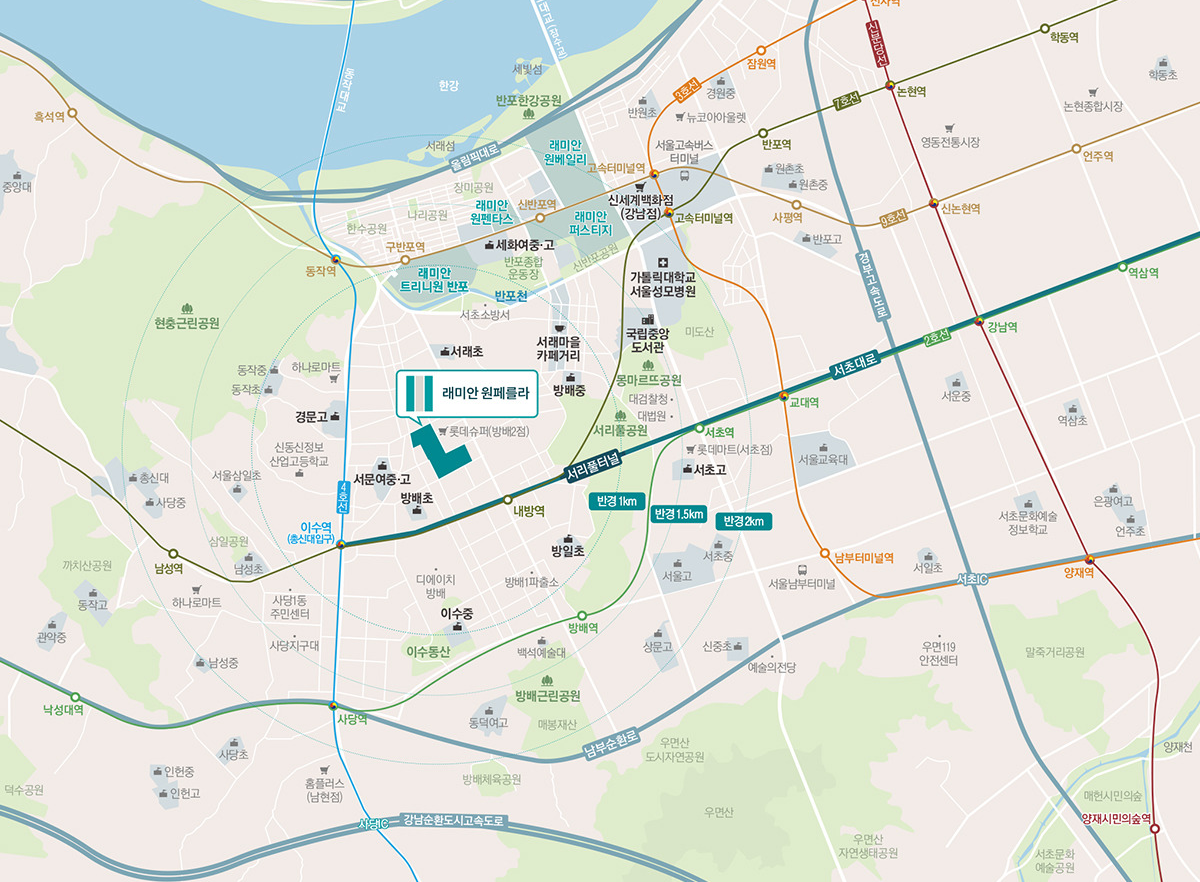 - 교통 : 7호선 내방역, 4·7호선 이수역, 서초대로, 서리풀터널을 통한 강남 접근성