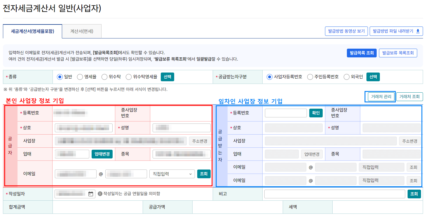 3. 우측 빨간색 부분에는 본인 사업장 정보 기입 & 좌측 파란색 부분에는 임차인 사업장 정보 기입
