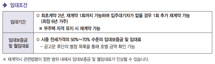 - 임대기간은 최초계약 2년, 재계약 1회까지만 가능하여 최대 4년 거주 가능합니다. (단, 입주대기자가 없을 경우 1회 추가 재계약 가능하여 최대 6년 거주 가능합니다.)