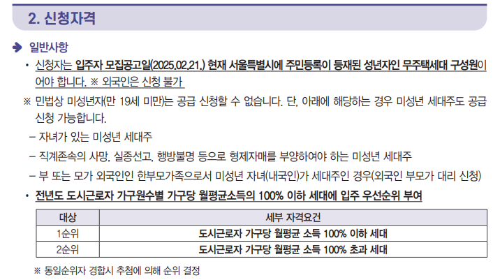 - 입주자 모집공고일(2025년 2월 21일) 현재 서울특별시에 주민등록이 등재된 만 19세 이상 성인