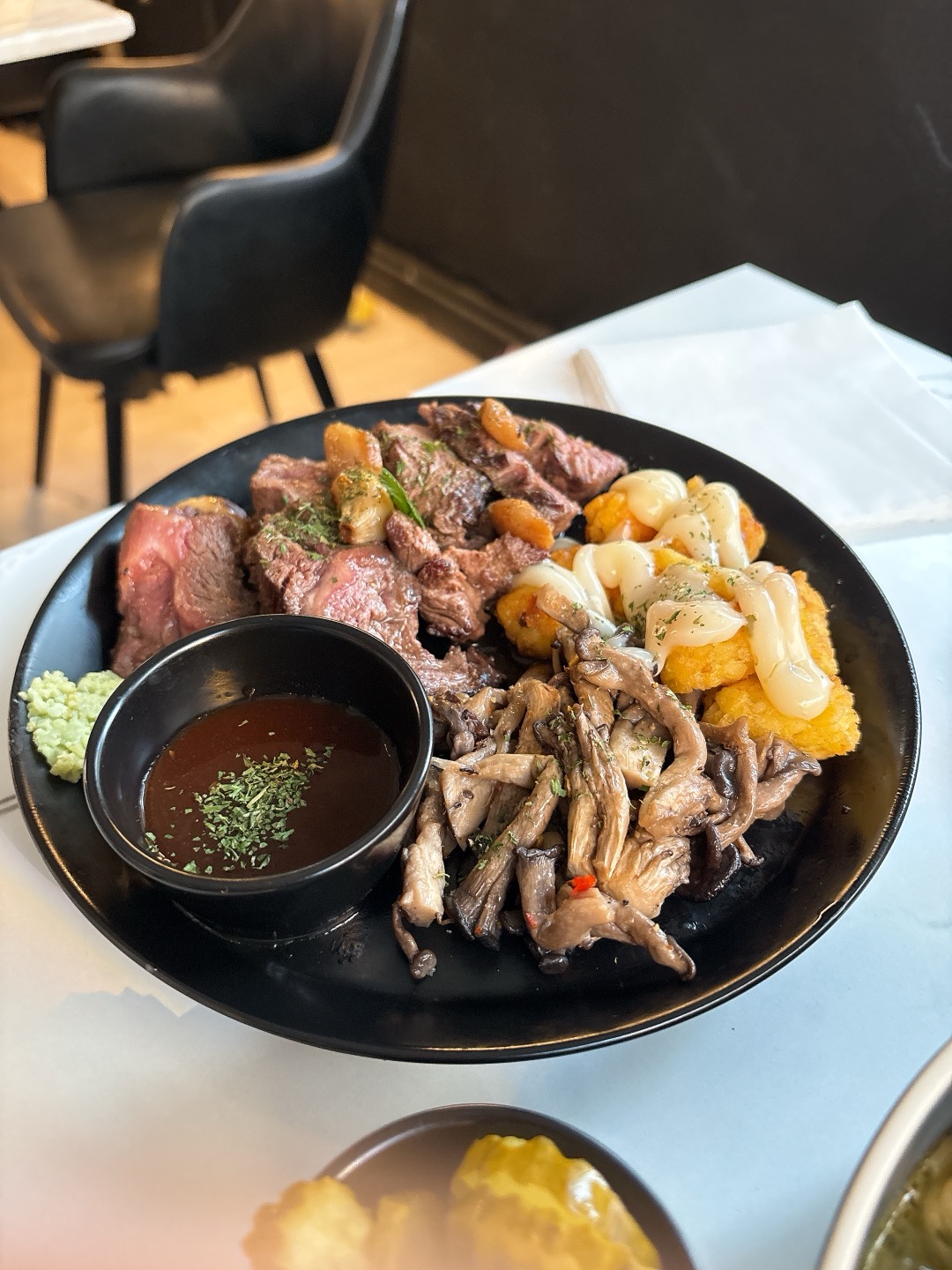 잡내 없이 고소한 고기 본연의 맛이 살아있고, 구운 감자와 버섯, 와사비, 머스타드 등 곁들임도 센스 있게 나와요.