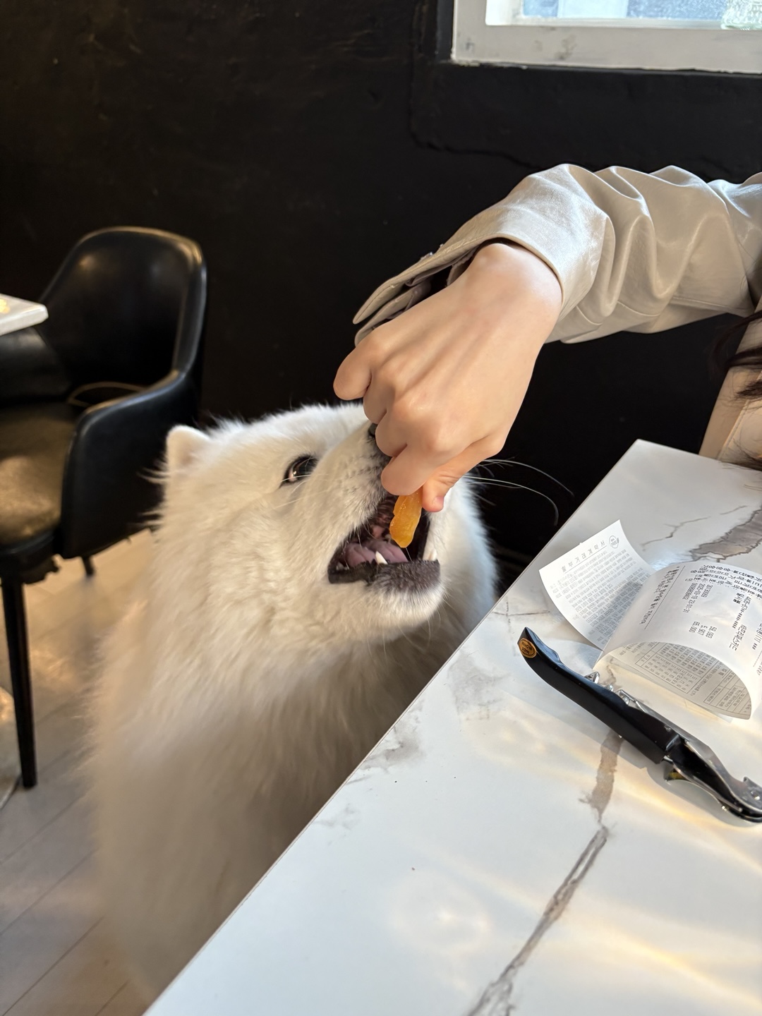 블랑누아에 오면 꼭 보르도에게 간식을 챙겨주고 싶었는데, 준비해간 강아지 간식을 보르도에게 직접 건네주니 꼬리를 흔들며 정말 좋아했어요.