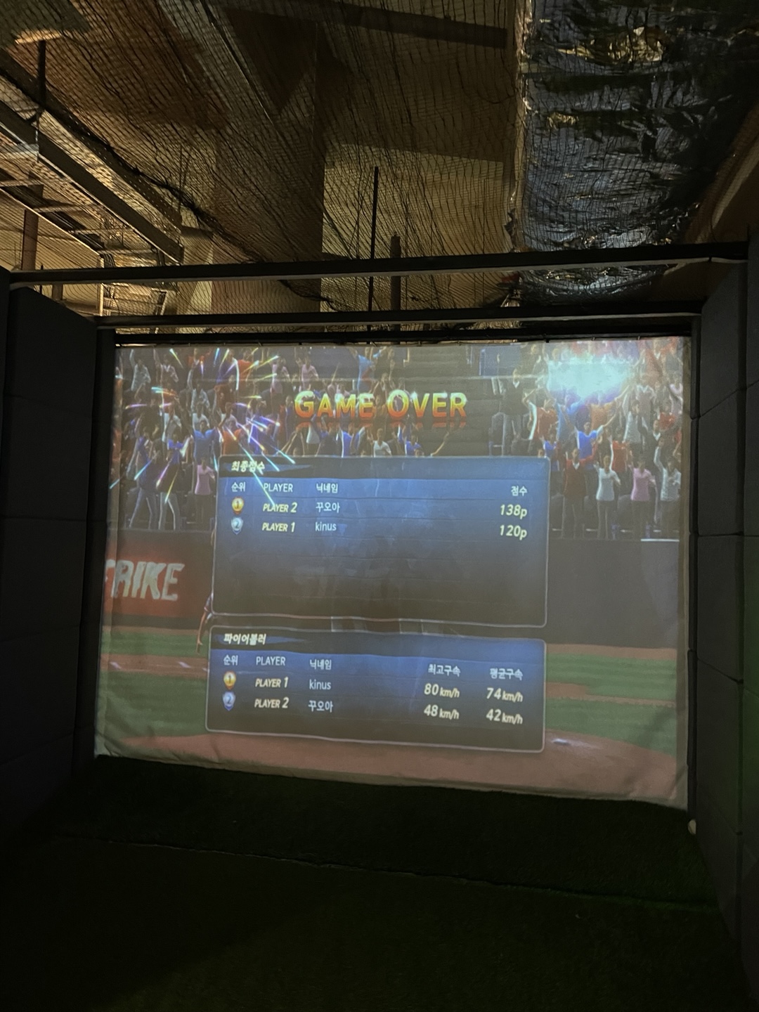 실제 투수 마운드에 서서 스크린에 공을 던지면, 속도와 스트라이크 여부가 바로 기록으로 나와요.